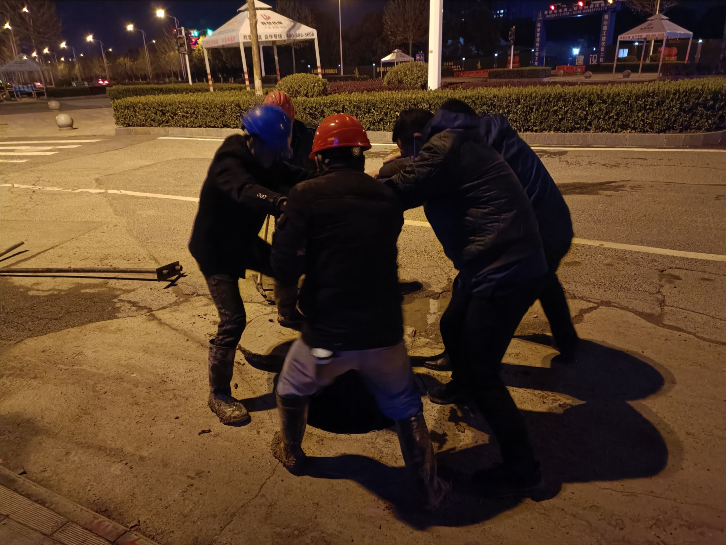 晚上10点,更换工作正式开始,关闸止水、排空积水、拆除旧蝶阀、安装新蝶阀,流程看似简单,但每道工序都有严格的操作规程,需要现场每个人的付出和配合。时值倒春寒天气,现场寒风阵阵,工作坑内更是寒气逼人,但维修人员全然不顾,抢时间,争速度,分工协作,轮流上阵,连续作战。