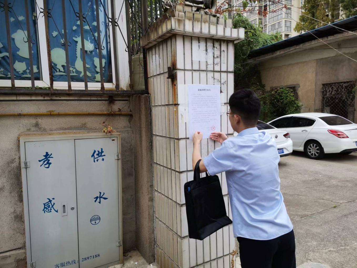 检查小组一行到一水厂张贴了《菜地清理告知书》并对水厂宿舍楼周边进行察看。检查发现,除一水厂复式楼院墙边小菜园外,原废弃清水库上面也有居民种菜,存在巨大安全隐患。