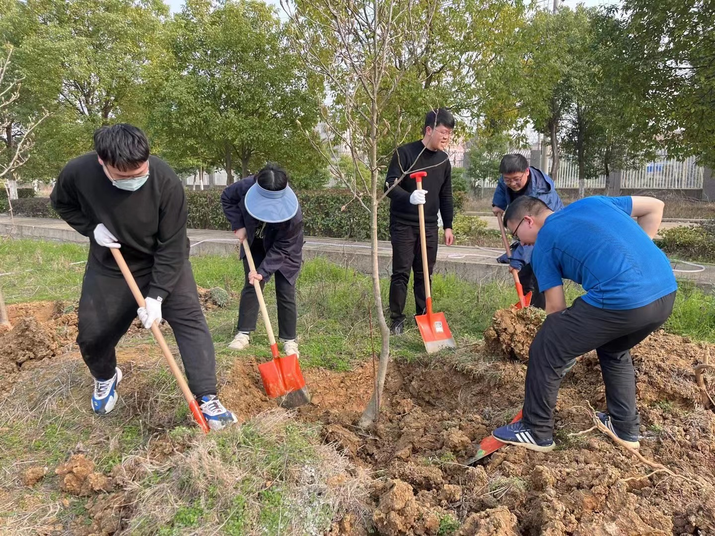志愿者们一行三十余人,来到了八一水厂院内待种植绿化苗木的空地。活动开始后,大家分工合作,铲土入坑、扶苗培土,干得热火朝天。