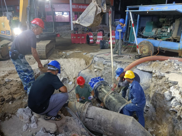 经测算,此次城站路-长征路段改造老旧管网共计773米,采用球墨铸铁管DN500口径管材。由于该路段岔路口较多,南北侧共计需安装16处支管,施工难度大。为确保工程进度,8月19日,我公司工作人员提前进场,倒排工期,抽调人员24小时驻守现场,统筹协调,全力配足人力及机械。同时,科学安排昼夜轮班施工,在保证质量的前提下快速推进整体项目进度。