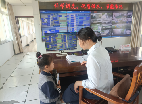 在调度中心,我公司工作人员告诉小朋友们,市民使用的水是从70公里外的汉江水源输送过来的,经过处理后不间断地输送到千家万户。并用通俗易懂的方式讲解了水从浑浊变清澈的处理过程。