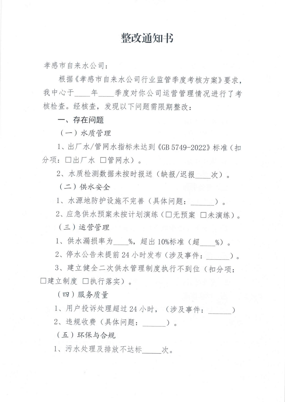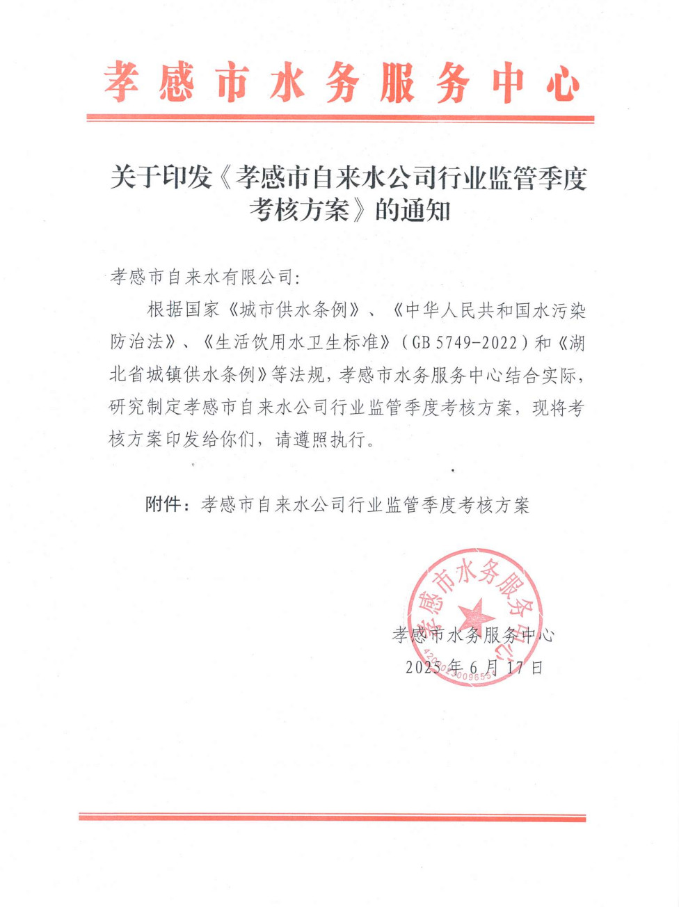 关于印发《孝感市自来水公司行业监管季度考核方案》的通知
