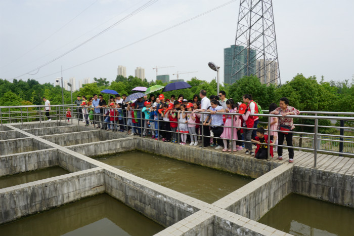 小记者们都是第一次走进水厂,对每道生产流程都非常好奇,对每件处理设施都饶有兴趣,一路走一路七嘴八舌地询问;三水厂工作人员则结合水处理流程和工作原理,用浅显而生动的语言为他们一一讲解说明,耐心细致地解答着每一个提问。在反应沉淀池上,小记者们看到了浑浊的源水由两根巨大输水管道输送到絮凝反应池里,当他们得知这里的源水都是来自34公里以外的汉江时,不由得咋舌惊叹“原来我们每天喝的自来水需要输送那么远的距离啊,真是太不容易了!”
