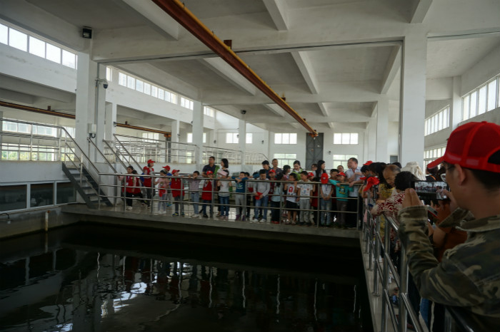 来到宽阔狭长的平流沉淀池边,小记者们亲眼看到在高分子聚合氯化铝的作用下,原本浑浊的源水一点点变得清澈透明。在过滤车间,他们认真观察滤池反冲洗和水质变化的过程;走进送水泵房,他们在水泵机组轰鸣的运行声中,细心倾听处理好的干净自来水是如何送到千家万户的。