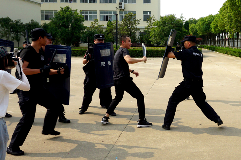 接警后,孝南公安分局巡逻大队、治安大队和南大派出所组织了16名警察和特勤队员荷枪实弹赶到现场,并在现场指挥员的果断指挥下迅速完成外围监守布防和内线包围突进,不到一分钟就夺下凶器,干净利落地将“暴恐分子”制服收押。