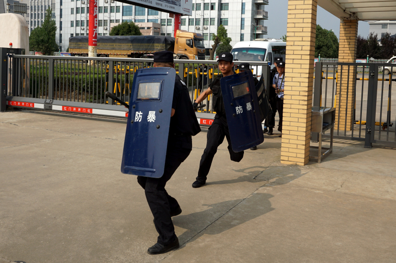 5月17日15时30分,一来历不明的“暴恐分子”突然闯入我公司三水厂厂区,意图持刀“行凶”;水厂保安人员迅速报警,并利用防暴器械与其周旋。随后公安特勤人员快速赶到现场,一举将“暴恐分子”包围制服,果断处置了一场突发“暴恐”事件。