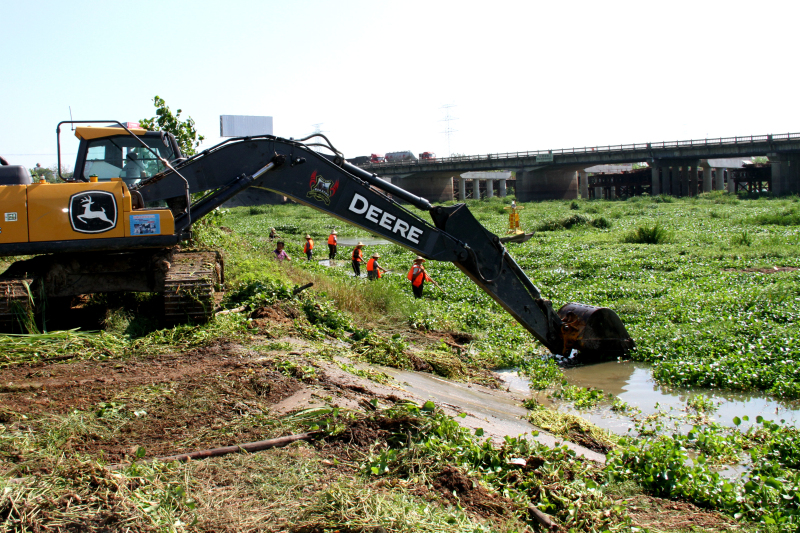 在沦河备用水源地保护区,由河长办和属地政府组织的清剿队已全面进场,清除作业正在紧张进行中。由于水葫芦根系交错,在水面上密织在一起,牵一发需动全身,常规的清除方式效率低下。为加快清除进度,清剿队采取机械与人工共同作业、分而治之的方式,即由工作人员先驾船将成片的水葫芦根系分割打散,切块后推往岸边;到近岸处再用机械反铲上岸,堆集碾压暴晒后,装运到垃圾压缩站,避免水葫芦枯死腐败对水源造成二次污染,确保“斩草除根”,恢复河道生态平衡。
