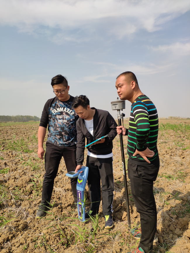 上午8时整,专班的 3名小伙子已经打理调试好巡线仪、GPS定位仪、平板电脑、标志彩旗等装备,拎上几瓶水就驱车启程了。将近一个小时的车程里,他们也没耽搁,结合地形图一路商量着现场测量方案。9时许,一行人顺利抵达汉北河段第一个测量点。时节已是深秋,现场满眼望去,大片荒颓的田野上尽是半米高的杂草、灌木,没有一丝供水设施的影迹,看上去几乎无从着手。跟我们一脸茫然不同,小伙子们显然很有经验,他们说首先得找到闸阀的位置,闸阀的两端自然就是源水管线,由点及线,测量才好向下一步开展。但在这片荒野地上寻找一个闸阀,难度当然也不小。小伙子们明确分工,分别拿上仪器、彩旗一路排开,向堤内田野间开进。在仪器的辅助下,他们顺利识破了杂草的“伪装”,找到了第一个闸阀,有条不紊地对闸阀进行定位、测定坐标,并认真细致地在数字地形图上标定标点。接下来,就是以闸阀为工作点,向两端辐射查找和测量输水管线了;然后就进入下一个测量点,接着重复这一套“标准动作”。