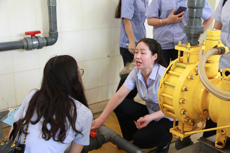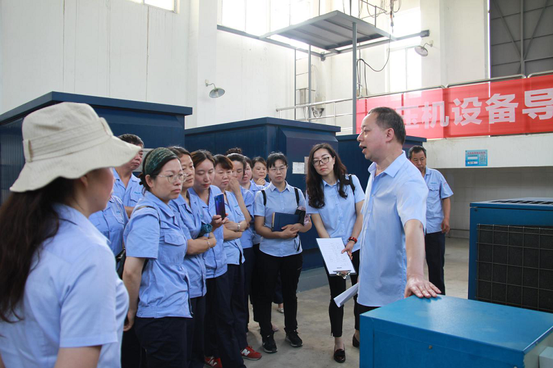 培训过程中,丁厂长首先向大家介绍了三水厂的基本情况和水质安全的重要性,随后带领大家来到净化池。通过现场参观,给水厂职工讲解了净化池的工作原理及基本工艺流程。理论知识授课完毕后,丁厂长还带领大家来到车间,对各种设备设施进行了现场讲解,并对空压机设备导换、加药泵设备导换进行了实地操练 。