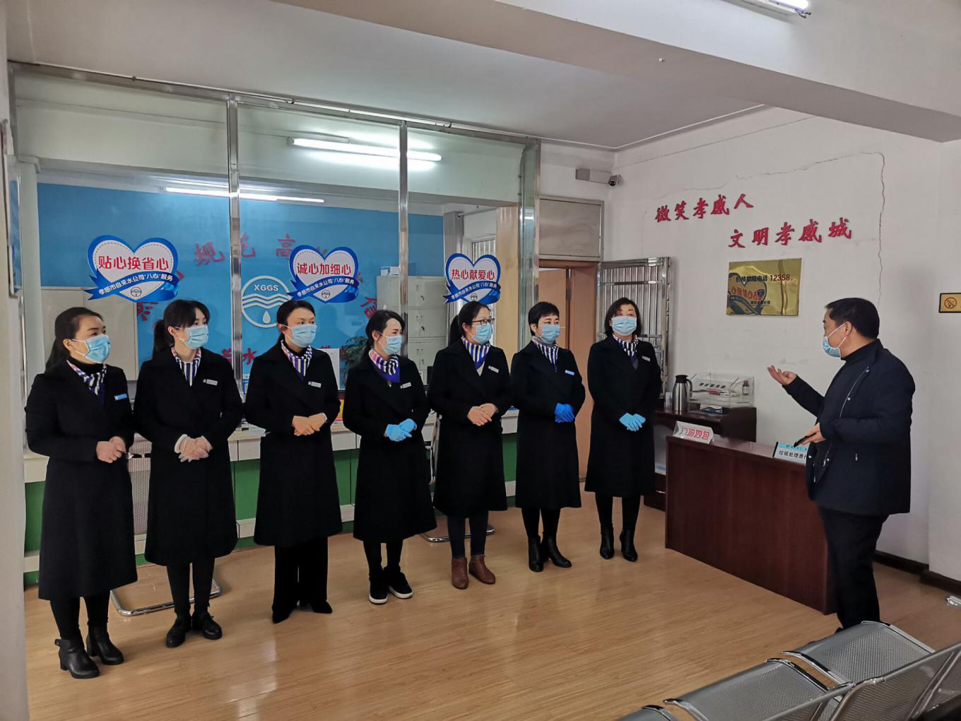 当天上午8:00左右,公司所辖的玉泉路、市民之家、城站路三个客服营业网点,早早开门受理业务。大厅接待场所全面消杀、门口临时增放候位板凳、布置安全防护设施等等。窗口人员按照要求配带口罩,久违的微笑、贴心的问候如沐春风。