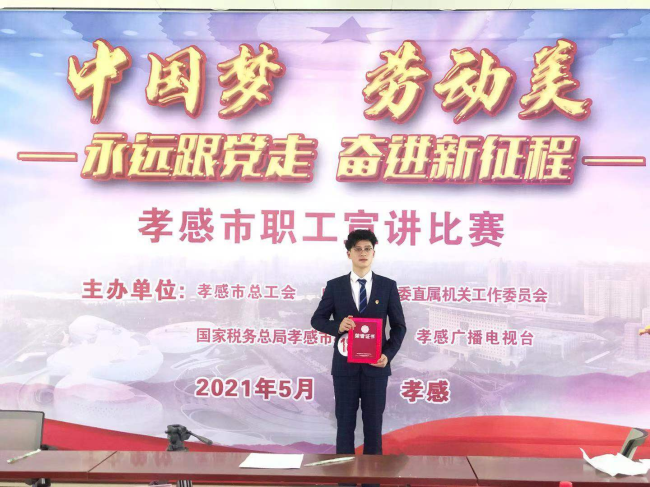 为庆祝建党一百周年,推动群众性主题宣传教育活动走深走实,5月8日,“中国梦·劳动美——永远跟党走 奋进新征程”孝感市职工宣讲比赛决赛举行,公司新员工梁航参加了此次演讲比赛。