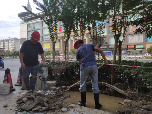 9月9日,我们跟随抢修车辆来到了今天的第一站:乾坤商务酒店门口,由于管道漏水,现场不断有水从地底渗出,加上地点特殊我们抢修工只能用铁锹等工具将道路破开,再找出破损位置,对管道进行更换维护处理。