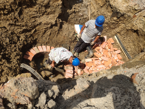 随后我们来到了第二处:澴川路公安局前,由于市政工程导致此处水源口需要置换,前几日将管道接好后,今天我们抢修工正在给该处总表闸阀修砌闸表井。