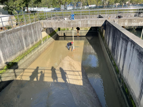 11月10日,在三水厂一期回收水池上,几名机修工正在进行切割拆除工作,完成原有旧设备拆除后,他们将进行回收水池搅拌系统升级改造。